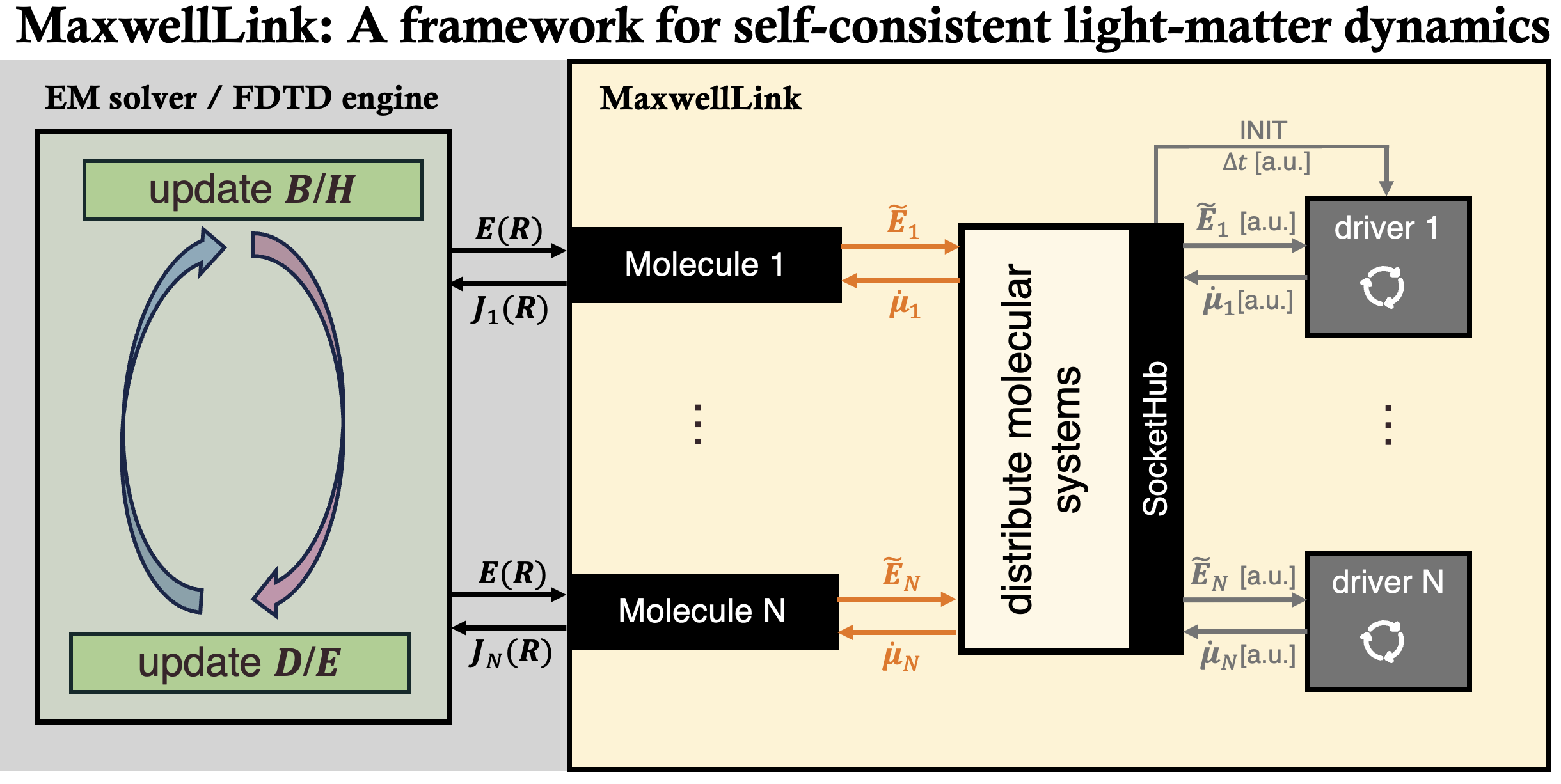 MaxwellLink provides a flexible software bridge between electromagnetic (EM) solvers, such as finite-difference time-domain (FDTD) approach, and quantum or classical molecular dynamics engines. The toolkit originated in the TEL Research Group at University of Delaware and is designed for self-consistent light-matter simulations in which both the EM and molecular subsystems evolve using state-of-the-art computational methods.